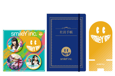 smileY inc.をイメージしてデザインされた、「缶バッジセット(全4種)」「アクリルスマートフォンスタンド」「社員手帳風ノート」の計3アイテムのセットです。POPでカラフルなアイテムの中に、コーポレートグッズとして社員手帳までしっかり入った、smileY inc.らしいグッズセットです♪
